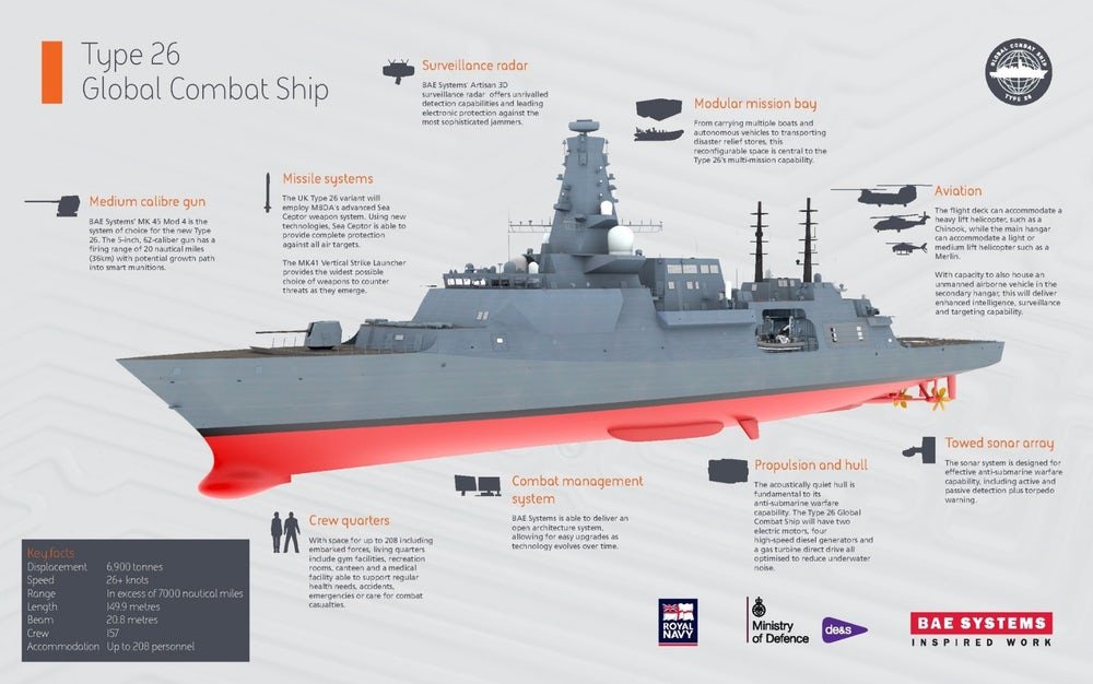 26型护卫舰也被称作全球战斗舰,是英国皇家海军用来取代22型“大刀”级护卫舰和23型“公爵”级护卫舰的一款多用途护卫舰。2010年BAE系统公司获得了价值1·27亿英镑(1·89亿美元)的研发合同,并制定26型新型护卫舰的详细规格。2012年8月20日,英国国防部正式公布了26型导弹护卫舰的最新设计。2017年7月20日,26型护卫舰首舰“格拉斯哥”号在BAE系统公司位于格拉斯哥的高文造船厂切割首块钢板。